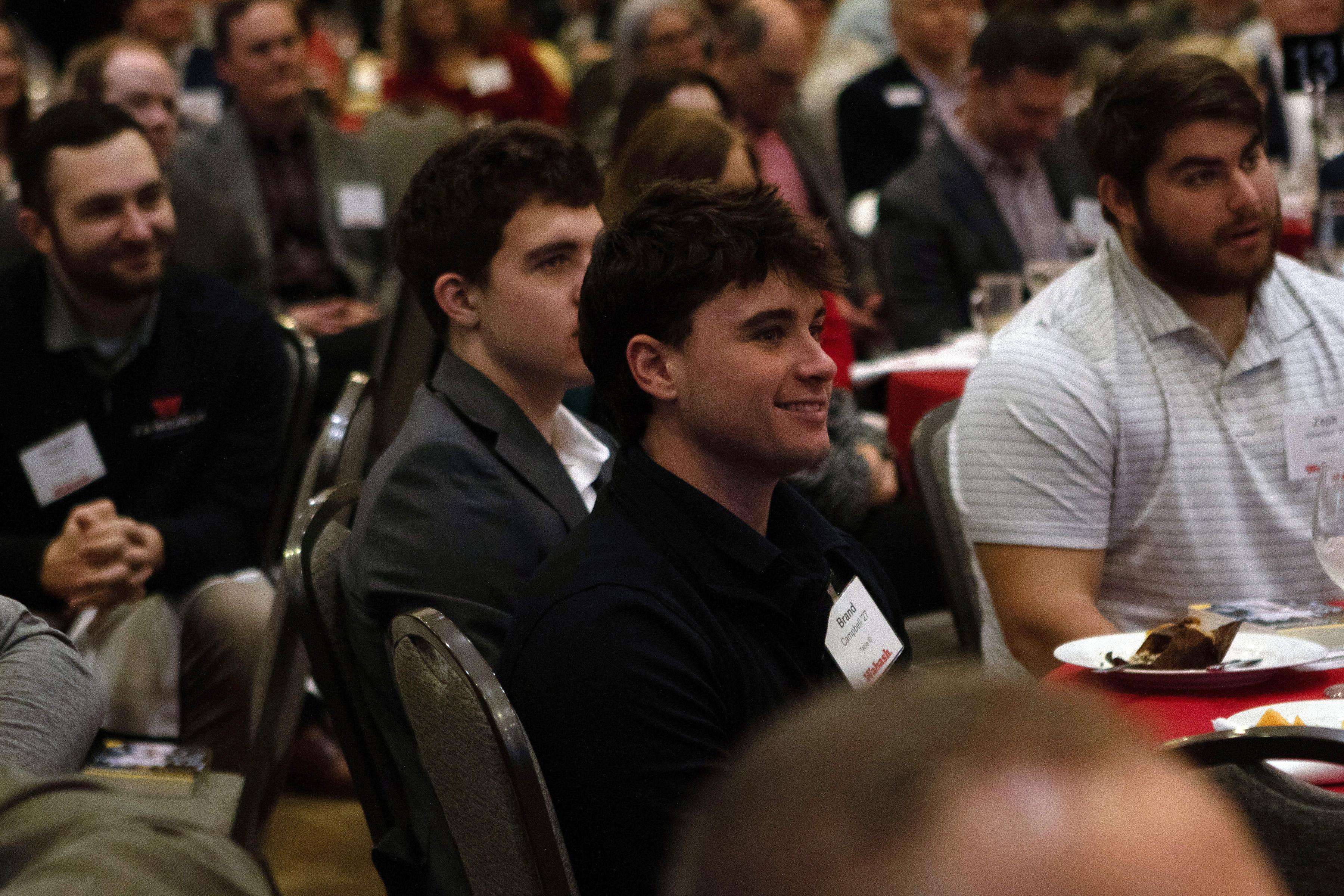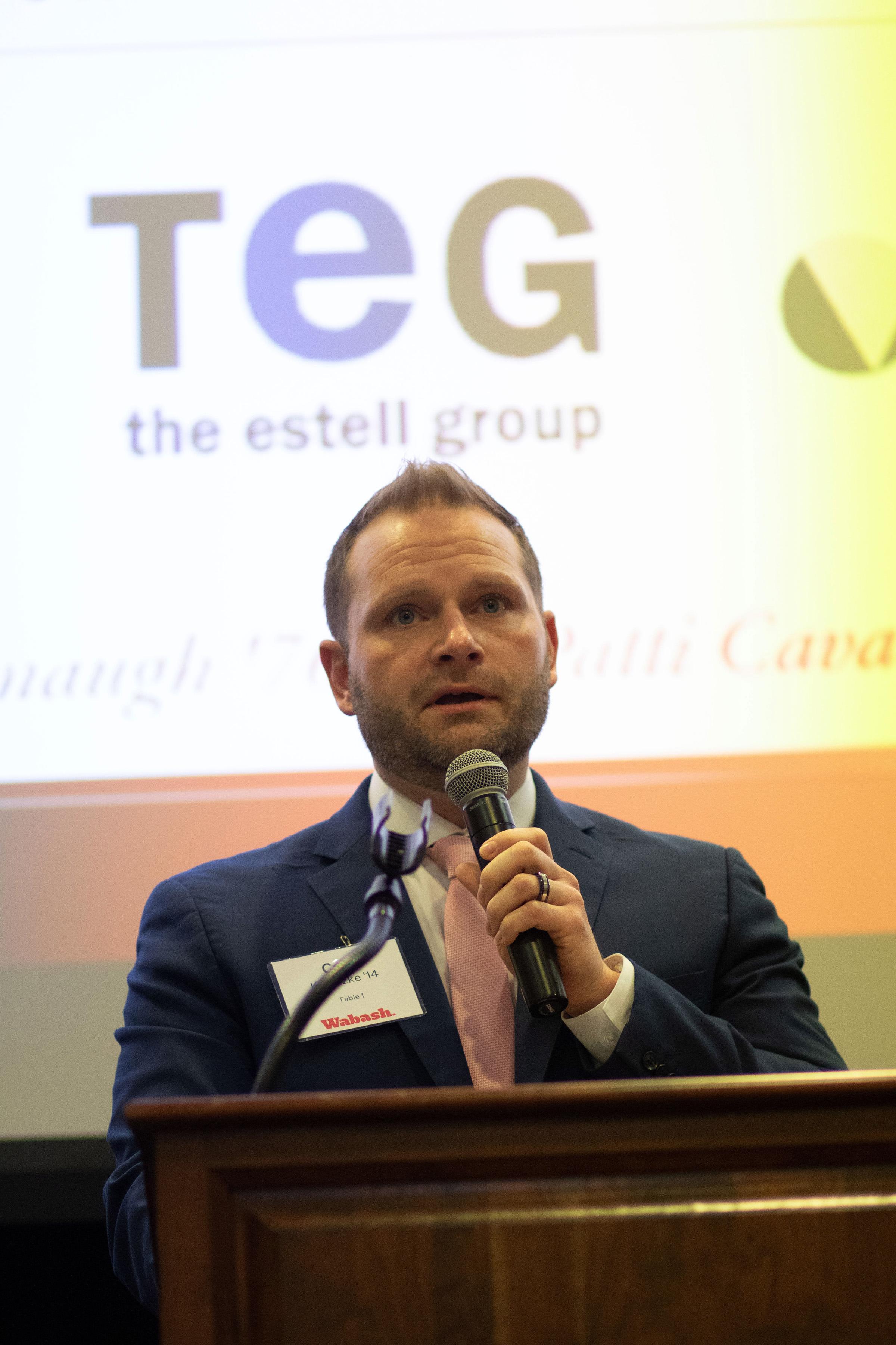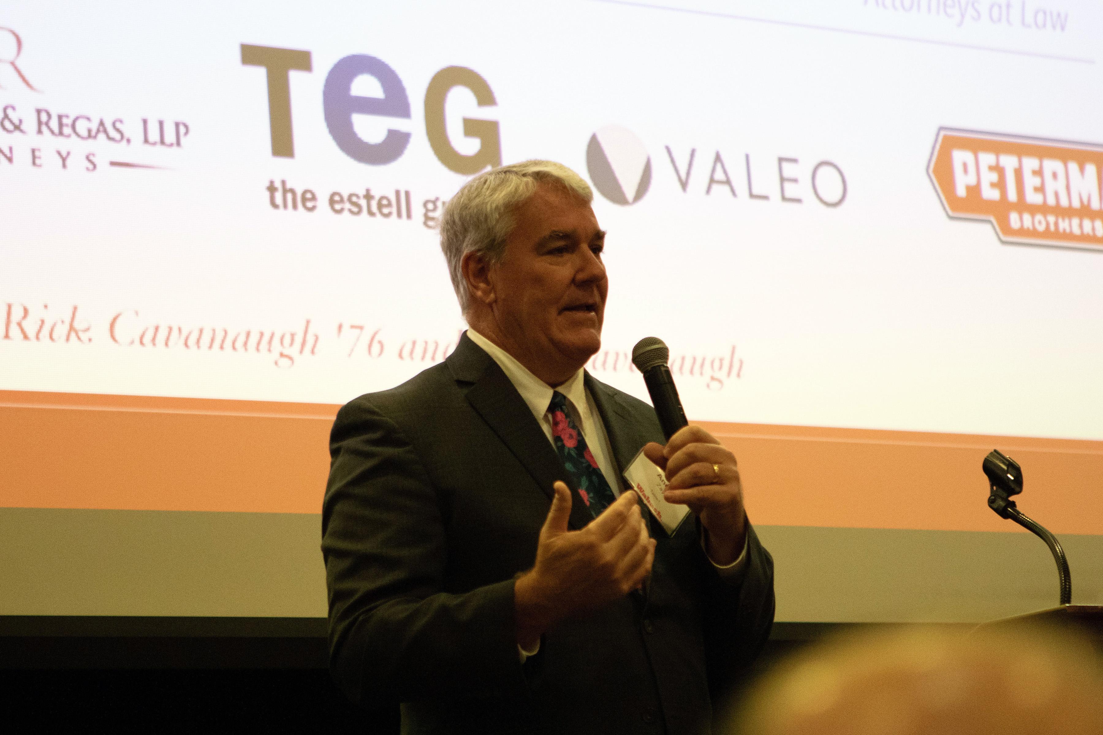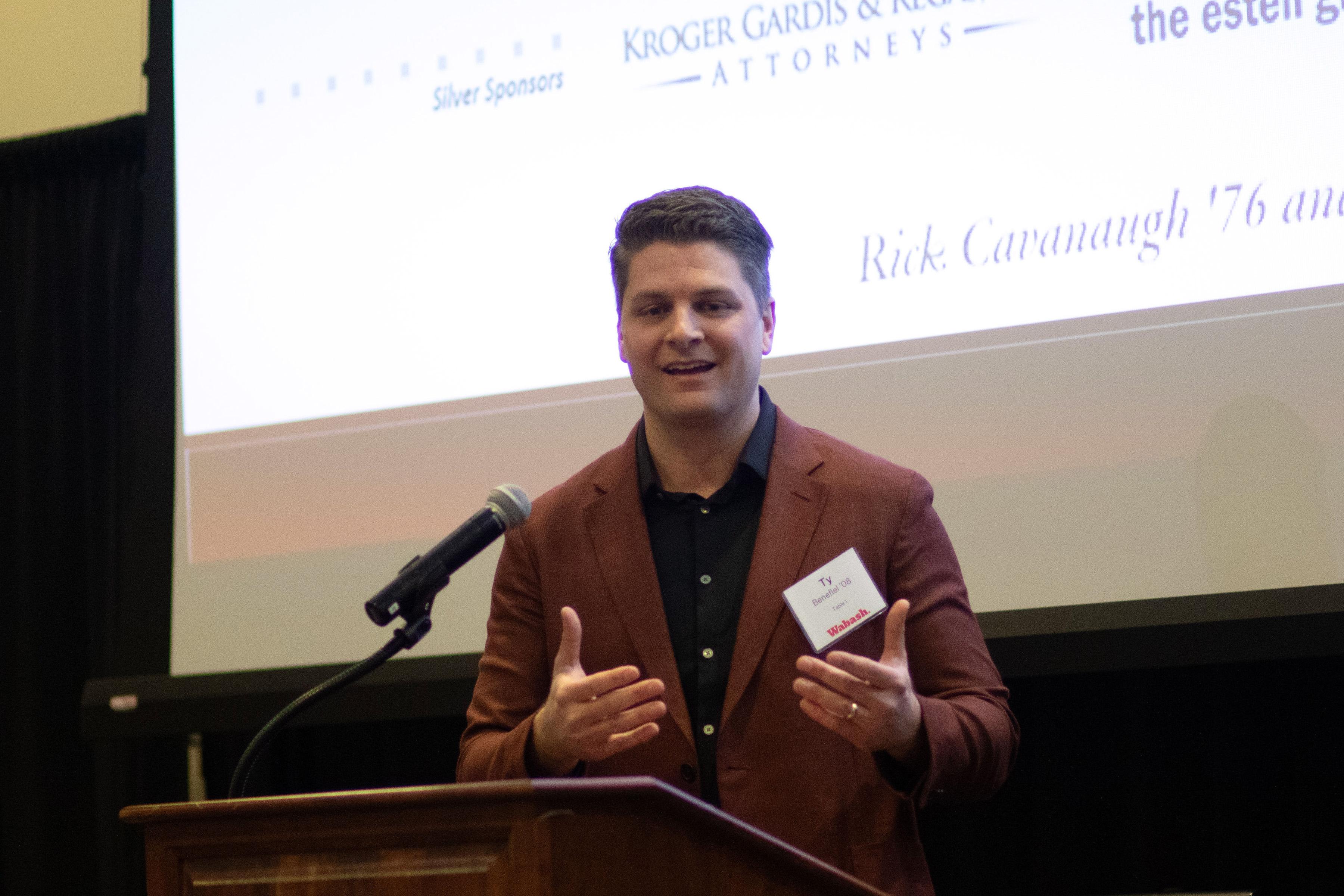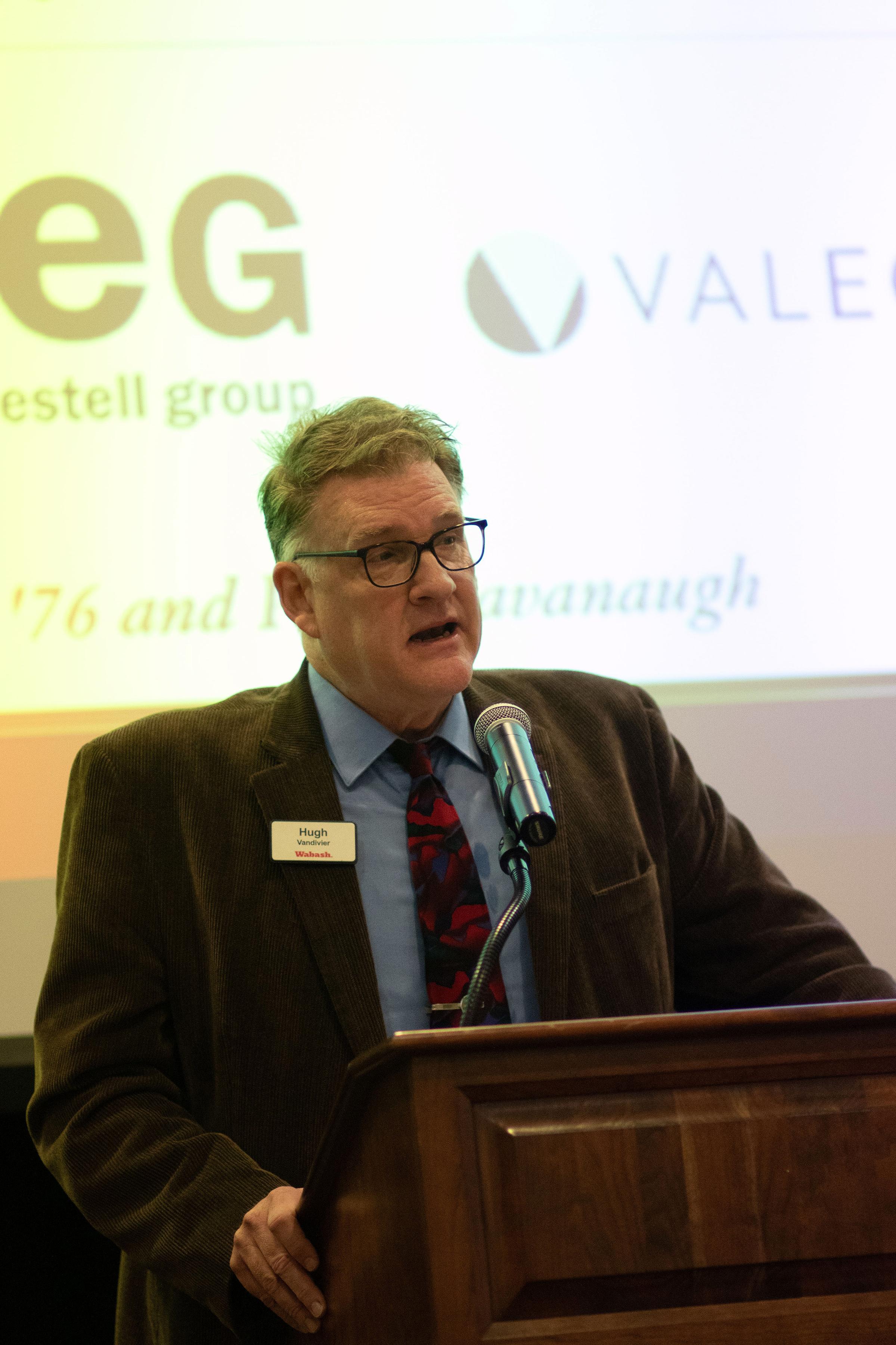 Selvio said, "On behalf of the Wabash Club of Indianapolis, thank you for being here. Seeing this room filled as it is, with alumni, friends, and supporters of Wabash is energizing. Events like this are a powerful reminder of what Wabash College is, and it's not just simply a place we attend. It is a community we carry with us. I want to offer my sincere thanks to the speakers, to our guests, and those who work behind the scenes. These gatherings never happen by accident. They are the result of generosity, volunteerism, and a shared belief that our relationships matter."