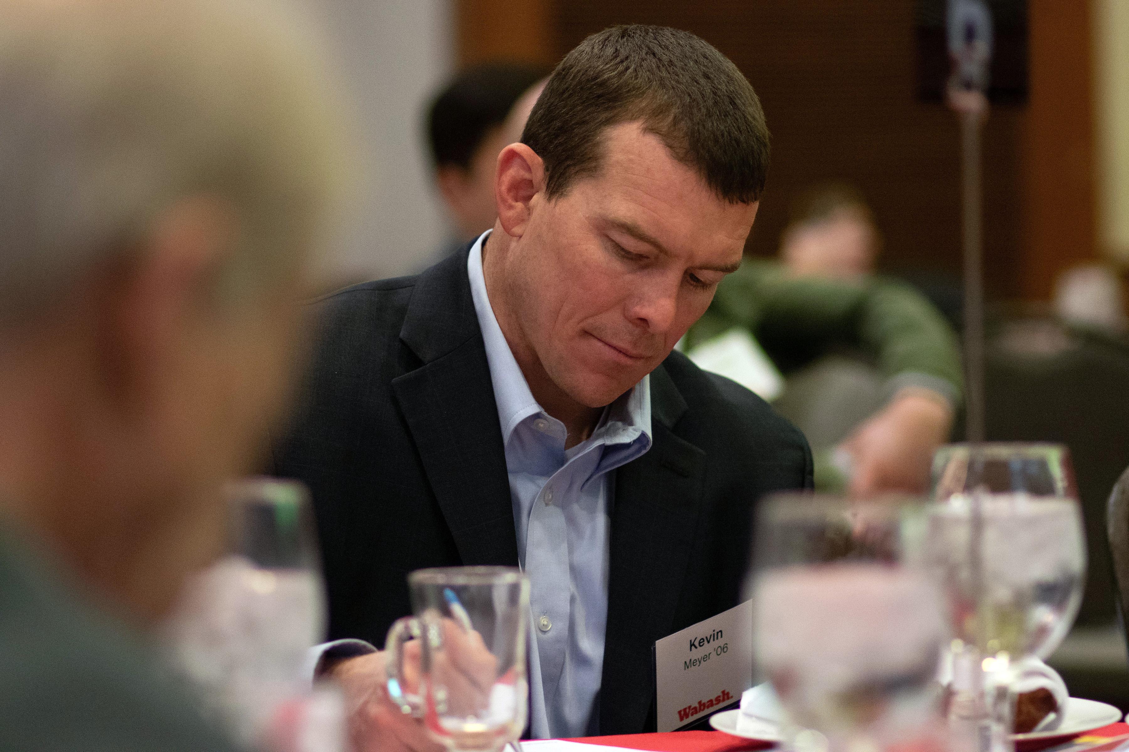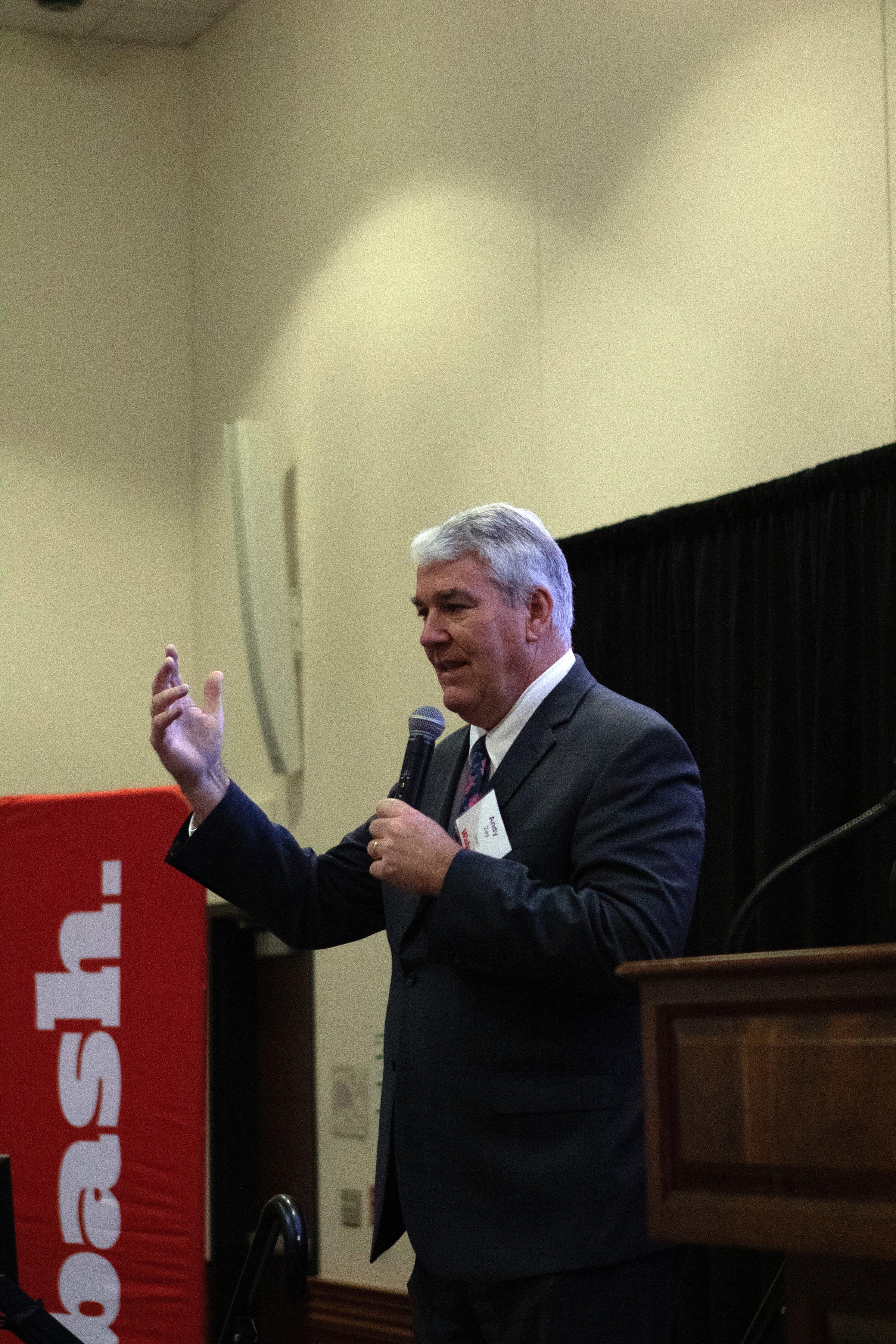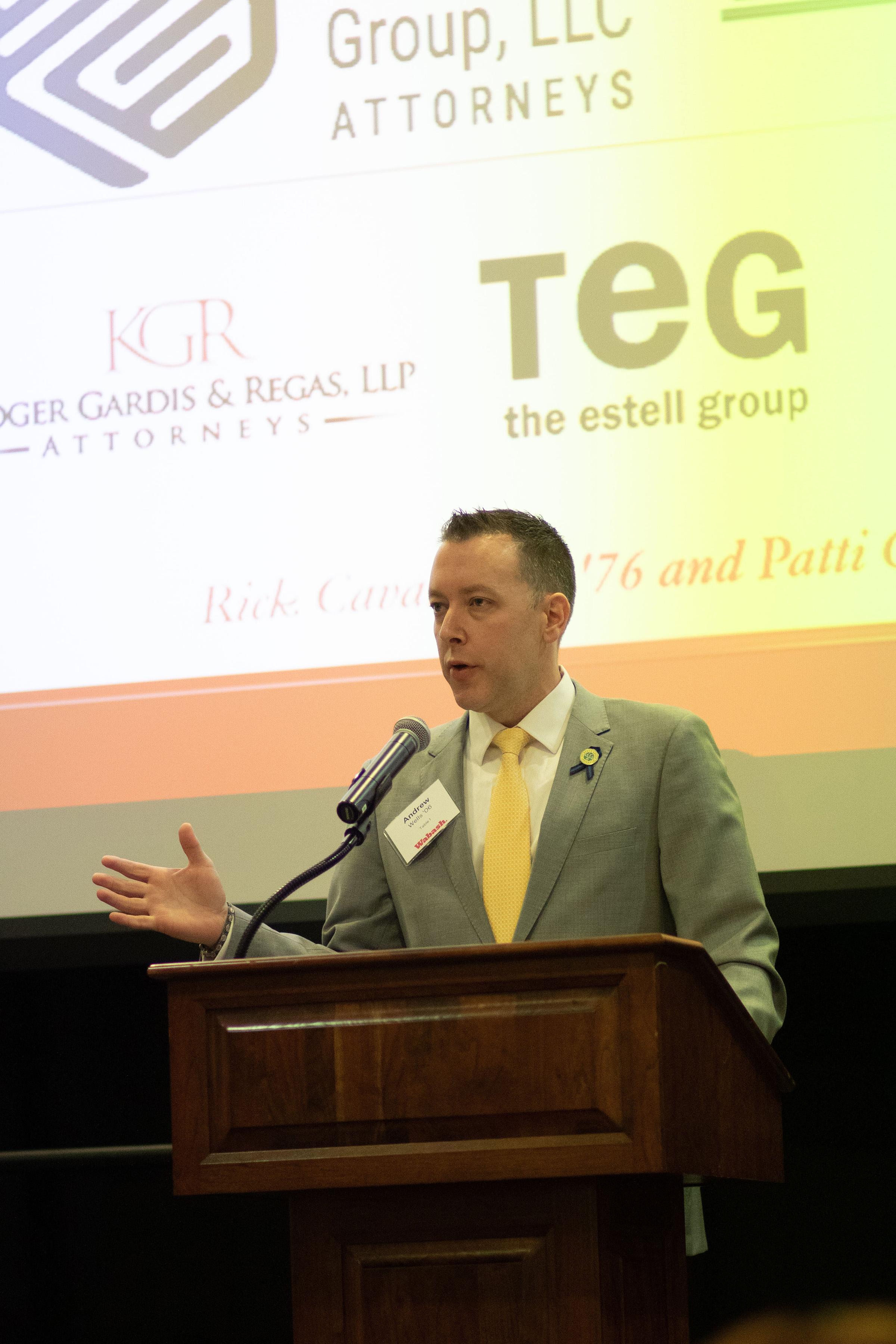 After a brief story involving his time at Wabash and Prof. Warner, Andrew Wells '06, general counsel Indiana for Duke Energy, said, "Think about this. It's 6:30 a.m. on a dark, cold February morning, maybe much like today, and you're turning off your alarm, you're making coffee, you're getting your kids off to school, you're heading into the office. Your house stayed warm all night. The traffic signals are flashing properly. On your way in, you're listening to the radio. Businesses, schools, hospitals across Indiana are starting another day. Duke Energy-Indiana prides itself on being part of that moment. That's where we are. We're making sure those things are delivering for you...the things that you take for granted every day,"