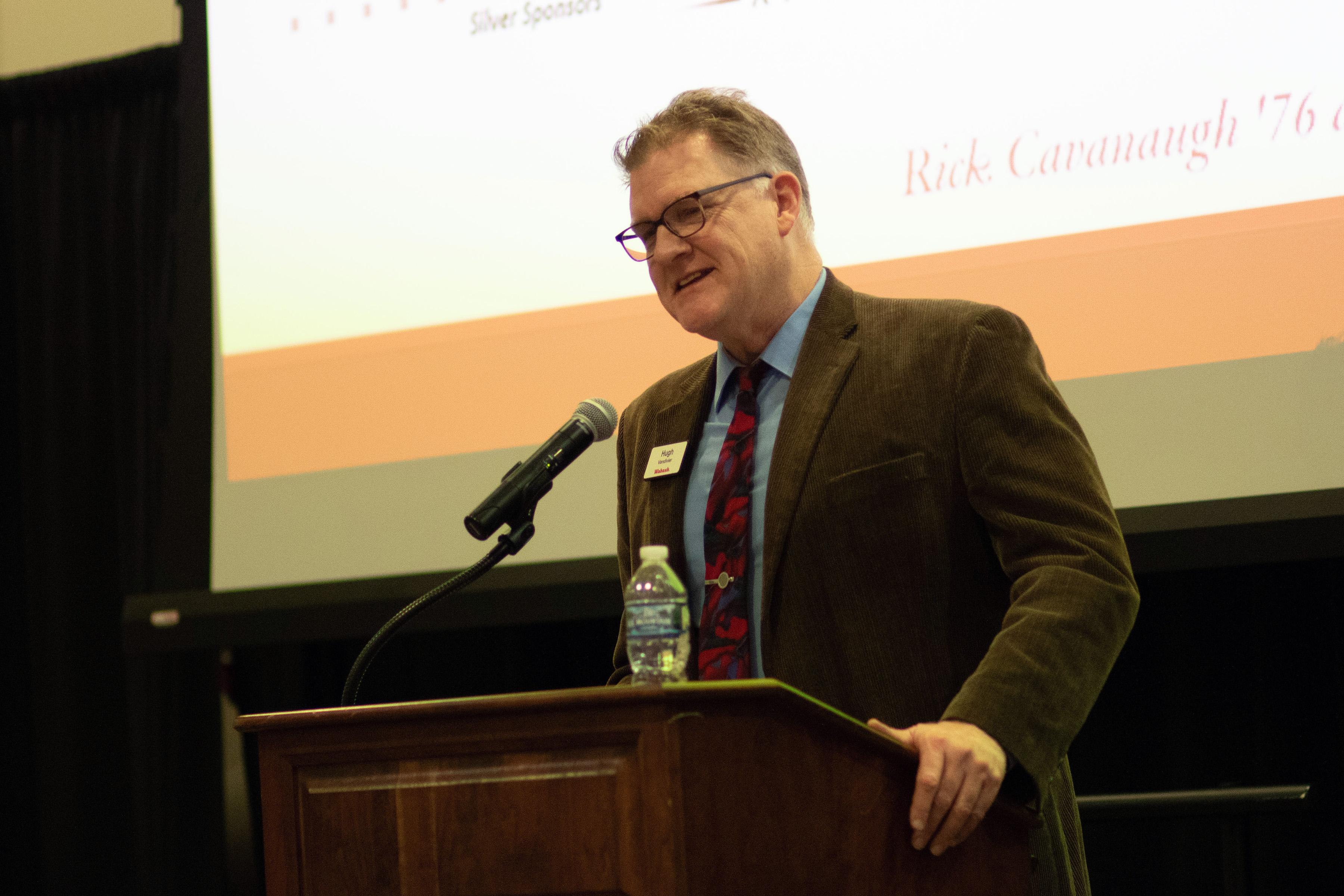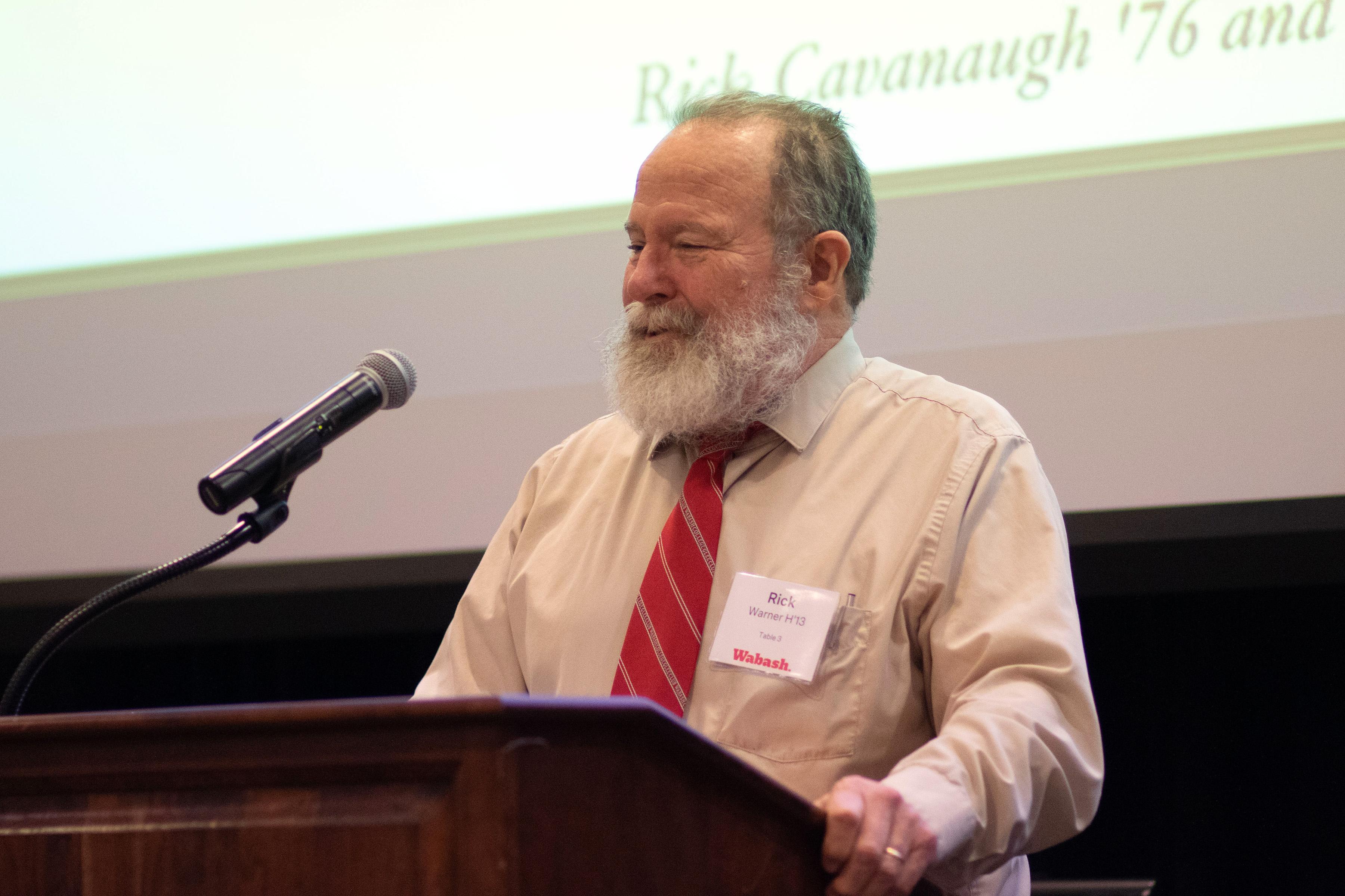 Hugh Vandivier '91, associate director of advancement initiatives - annual giving and advancement communications, introduced the WCI Man of the Year. He opened his introduction by stating, "Like a good mole and a great chef, Rick Warner's presence at Wabash has added a rich, complex, robust flavor that's long simmering…living across the street from campus at 308 West Wabash Avenue, to be precise, his expanded kitchen is not just a culinary workspace from which he bakes muffins that are always available in his office or house made ice cream that he delivers across campus, or even a Vietnamese pho that he might serve up for lunch before his vision three colloquium, this home kitchen sometimes substitutes as a second classroom.